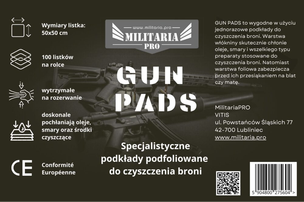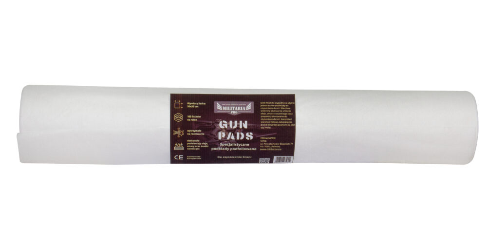 GUN PADS to wygodne w użyciu jednorazowe podkłady do czyszczenia broni. Warstwa włókniny skutecznie chłonie oleje, smary i wszelkiego typu preparaty stosowane do czyszczenia broni. Natomiast warstwa foliowa zabezpiecza przed ich przesiąkaniem na blat czy matę.